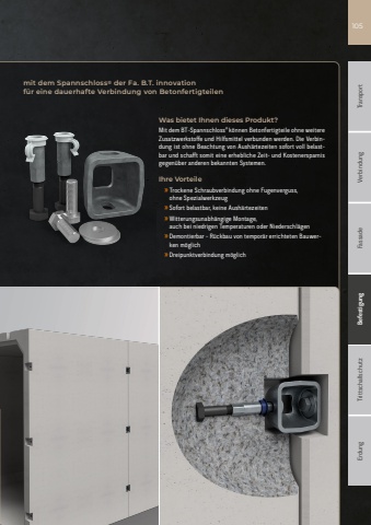 Fassade Befestigung Trittschallschutz Erdung Transport Verbindung105mit dem Spannschloss%u00ae der Fa. B.T. innovationf%u00fcr eine dauerhafte Verbindung von BetonfertigteilenWas bietet Ihnen dieses Produkt?Mit dem BT-Spannschloss%u00ae k%u00f6nnen Betonfertigteile ohne weitere Zusatzwerkstoffe und Hilfsmittel verbunden werden. Die Verbindung ist ohne Beachtung von Aush%u00e4rtezeiten sofort voll belastbar und schafft somit eine erhebliche Zeit- und Kostenersparnis gegen%u00fcber anderen bekannten Systemen.Ihre Vorteile%u00bb Trockene Schraubverbindung ohne Fugenverguss,ohne Spezialwerkzeug%u00bb Sofort belastbar, keine Aush%u00e4rtezeiten%u00bb Witterungsunabh%u00e4ngige Montage,auch bei niedrigen Temperaturen oder Niederschl%u00e4gen%u00bb Demontierbar - R%u00fcckbau von tempor%u00e4r errichteten Bauwerken m%u00f6glich%u00bb Dreipunktverbindung m%u00f6glich