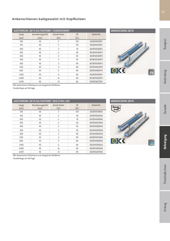 Fassade Befestigung Trittschallschutz Erdung Transport Verbindung111AUSF%u00dcHRUNG: 28/15 KALTGEFORMT, FEUERVERZINKTL%u00e4nge Verankerungstiefe Anzahl Anker VE Artikel-Nr.[mm] [mm] [St.] [St.]100 45 2 120 8228150100FV150 45 2 90 8228150150FV200 45 2 70 8228150200FV250 45 2 60 8228150250FV300 45 2 45 8228150300FV350 45 3 35 8228150350FV450 45 3 84 8228150450FV550 45 4 84 8228150550FV850 45 5 84 8228150850FV1.050 45 6 84 8228151050FV3.050 45 16 84 8228153050FV6.070 45 31 84 8228156070FV- Mit elastischem F%u00fcllschaum und integrierter Rei%u00dfleine- Sonderl%u00e4nge auf AnfrageAUSF%u00dcHRUNG: 28/15 KALTGEFORMT, EDELSTAHL (A4)L%u00e4nge Verankerungstiefe Anzahl Anker VE Artikel-Nr.[mm] [mm] [St.] [St.]100 45 2 120 8228150100VA150 45 2 90 8228150150VA200 45 2 70 8228150200VA250 45 2 60 8228150250VA300 45 2 45 8228150300VA350 45 3 35 8228150350VA450 45 3 84 8228150450VA550 45 4 84 8228150550VA850 45 5 84 8228150850VA1.050 45 6 84 8228151050VA3.050 45 16 84 8228153050VA6.070 45 31 84 8228156070VA- Mit elastischem F%u00fcllschaum und integrierter Rei%u00dfleine- Sonderl%u00e4nge auf AnfrageANKERSCHIENE 28/15ANKERSCHIENE 28/15Ankerschienen kaltgewalzt mit KopfbolzenFVFVA4A4