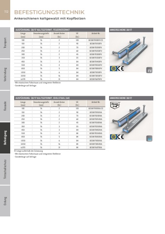 Fassade Befestigung Trittschallschutz Erdung Transport Verbindung112AUSF%u00dcHRUNG: 38/17 KALTGEFORMT, FEUERVERZINKTL%u00e4nge Verankerungstiefe Anzahl Anker VE Artikel-Nr.[mm] [mm] [St.] [St.]100 76 2 120 8238170100FV (1)150 76 2 90 8238170150FV200 76 2 70 8238170200FV250 76 2 60 8238170250FV300 76 2 45 8238170300FV350 76 3 35 8238170350FV450 76 3 84 8238170450FV550 76 4 84 8238170550FV850 76 5 84 8238170850FV1.050 76 6 84 8238171050FV3.050 76 16 84 8238173050FV6.070 76 31 84 8238176070FV- Mit elastischem F%u00fcllschaum und integrierter Rei%u00dfleine- Sonderl%u00e4nge auf AnfrageAUSF%u00dcHRUNG: 38/17 KALTGEFORMT, EDELSTAHL (A4)L%u00e4nge Verankerungstiefe Anzahl Anker VE Artikel-Nr.[mm] [mm] [St.] [St.]100 76 2 120 8238170100VA (1)150 76 2 90 8238170150VA200 76 2 70 8238170200VA250 76 2 60 8238170250VA300 76 2 45 8238170300VA350 76 3 35 8238170350VA450 76 3 84 8238170450VA550 76 4 84 8238170550VA850 76 5 84 8238170850VA1.050 76 6 84 8238171050VA3.050 76 16 84 8238173050VA6.070 76 31 84 8238176070VA(1) L%u00e4nge au%u00dferhalb der Zulassung- Mit elastischem F%u00fcllschaum und integrierter Rei%u00dfleine- Sonderl%u00e4nge auf AnfrageBEFESTIGUNGSTECHNIKANKERSCHIENE 38/17ANKERSCHIENE 38/17Ankerschienen kaltgewalzt mit KopfbolzenFVFVA4A4