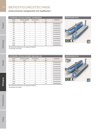 Fassade Befestigung Trittschallschutz Erdung Transport Verbindung114AUSF%u00dcHRUNG: 49/30 KALTGEFORMT, FEUERVERZINKTL%u00e4nge Verankerungstiefe Anzahl Anker VE Artikel-Nr.[mm] [mm] [St.] [St.]150 94 2 50 8249300150FV200 94 2 40 8249300200FV250 94 2 30 8249300250FV300 94 2 30 8249300300FV350 94 3 25 8249300350FV400 94 3 54 8249300400FV550 94 3 54 8249300550FV800 94 4 54 8249300800FV1.050 94 5 54 8249301050FV3.050 94 13 54 8249303050FV6.070 94 25 54 8249306070FV- Mit elastischem F%u00fcllschaum und integrierter Rei%u00dfleine- Sonderl%u00e4nge auf AnfrageAUSF%u00dcHRUNG: 49/30 KALTGEFORMT, EDELSTAHL (A4)L%u00e4nge Verankerungstiefe Anzahl Anker VE Artikel-Nr.[mm] [mm] [St.] [St.]150 94 2 50 8249300150VA200 94 2 40 8249300200VA250 94 2 30 8249300250VA300 94 2 30 8249300300VA350 94 3 25 8249300350VA400 94 3 54 8249300400VA550 94 3 54 8249300550VA800 94 4 54 8249300800VA1.050 94 5 54 8249301050VA3.050 94 13 54 8249303050VA6.070 94 25 54 8249306070VA- Mit elastischem F%u00fcllschaum und integrierter Rei%u00dfleine- Sonderl%u00e4nge auf AnfrageBEFESTIGUNGSTECHNIKANKERSCHIENE 49/30ANKERSCHIENE 49/30Ankerschienen kaltgewalzt mit KopfbolzenFVFVA4A4