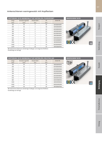 Fassade Befestigung Trittschallschutz Erdung Transport Verbindung117AUSF%u00dcHRUNG: 50/30 WARMGEWALZT MIT KOPFBOLZEN, FEUERVERZINKTL%u00e4nge Verankerungstiefe Anzahl Anker VE Artikel-Nr.[mm] [mm] [St.] [St.]150 94 2 40 8250300150FV200 94 2 30 8250300200FV250 94 2 25 8250300250FV300 94 2 25 8250300300FV350 94 3 15 8250300350FV400 94 3 54 8250300400FV550 94 3 54 8250300550FV800 94 4 54 8250300800FV1.050 94 5 54 8250301050FV3.050 94 13 54 8250303050FV6.070 94 25 54 8250306070FV- Mit elastischem F%u00fcllschaum, beidseitiger Endkappe und integrierter Rei%u00dfleine- Sonderl%u00e4nge auf AnfrageAUSF%u00dcHRUNG: 50/30 WARMGEWALZT MIT KOPFBOLZEN, EDELSTAHL (A4)L%u00e4nge Verankerungstiefe Anzahl Anker VE Artikel-Nr.[mm] [mm] [St.] [St.]150 94 2 40 8250300150VA200 94 2 30 8250300200VA250 94 2 25 8250300250VA300 94 2 25 8250300300VA350 94 3 15 8250300350VA400 94 3 54 8250300400VA550 94 3 54 8250300550VA800 94 4 54 8250300800VA1.050 94 5 54 8250301050VA3.050 94 13 54 8250303050VA6.070 94 25 54 8250306070VA- Mit elastischem F%u00fcllschaum, beidseitiger Endkappe und integrierter Rei%u00dfleine- Sonderl%u00e4nge auf AnfrageANKERSCHIENE 50/30ANKERSCHIENE 50/30Ankerschienen warmgewalzt mit KopfbolzenFVFVA4A4