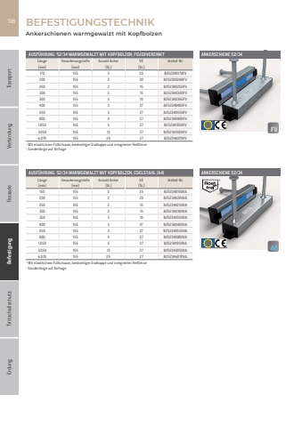 Fassade Befestigung Trittschallschutz Erdung Transport Verbindung118AUSF%u00dcHRUNG: 52/34 WARMGEWALZT MIT KOPFBOLZEN, FEUERVERZINKTL%u00e4nge Verankerungstiefe Anzahl Anker VE Artikel-Nr.[mm] [mm] [St.] [St.]170 155 2 25 8252340170FV200 155 2 20 8252340200FV250 155 2 15 8252340250FV300 155 2 15 8252340300FV350 155 3 10 8252340350FV400 155 3 27 8252340400FV550 155 3 27 8252340550FV800 155 4 27 8252340800FV1.050 155 5 27 8252341050FV3.050 155 13 27 8252343050FV6.070 155 25 27 8252346070FV- Mit elastischem F%u00fcllschaum, beidseitiger Endkappe und integrierter Rei%u00dfleine- Sonderl%u00e4nge auf AnfrageAUSF%u00dcHRUNG: 52/34 WARMGEWALZT MIT KOPFBOLZEN, EDELSTAHL (A4)L%u00e4nge Verankerungstiefe Anzahl Anker VE Artikel-Nr.[mm] [mm] [St.] [St.]150 155 2 25 8252340150VA200 155 2 20 8252340200VA250 155 2 15 8252340250VA300 155 2 15 8252340300VA350 155 3 10 8252340350VA400 155 3 27 8252340400VA550 155 3 27 8252340550VA800 155 4 27 8252340800VA1.050 155 5 27 8252341050VA3.050 155 13 27 8252343050VA6.070 155 25 27 8252346070VA- Mit elastischem F%u00fcllschaum, beidseitiger Endkappe und integrierter Rei%u00dfleine- Sonderl%u00e4nge auf AnfrageBEFESTIGUNGSTECHNIKANKERSCHIENE 52/34ANKERSCHIENE 52/34Ankerschienen warmgewalzt mit KopfbolzenFVFVA4A4