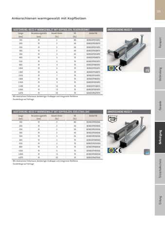 Fassade Befestigung Trittschallschutz Erdung Transport Verbindung119AUSF%u00dcHRUNG: 40/22-P WARMGEWALZT MIT KOPFBOLZEN, FEUERVERZINKTL%u00e4nge Verankerungstiefe Anzahl Anker VE Artikel-Nr.[mm] [mm] [St.] [St.]150 91 2 80 824022P0150FV200 91 2 50 824022P0200FV250 91 2 50 824022P0250FV300 91 2 40 824022P0300FV350 91 3 25 824022P0350FV400 91 3 70 824022P0400FV550 91 3 70 824022P0550FV800 91 4 70 824022P0800FV1.050 91 5 70 824022P1050FV1.300 91 6 70 824022P1300FV1.550 91 7 70 824022P1550FV1.800 91 8 70 824022P1800FV2.050 91 9 70 824022P2050FV2.300 91 10 70 824022P2300FV3.050 91 13 70 824022P3050FV6.070 91 25 70 824022P6070FV- Mit elastischem F%u00fcllschaum, beidseitiger Endkappe und integrierter Rei%u00dfleine- Sonderl%u00e4nge auf AnfrageAUSF%u00dcHRUNG: 40/22-P WARMGEWALZT MIT KOPFBOLZEN, EDELSTAHL (A4)L%u00e4nge Verankerungstiefe Anzahl Anker VE Artikel-Nr.[mm] [mm] [St.] [St.]150 91 2 80 824022P0150VA200 91 2 50 824022P0200VA250 91 2 50 824022P0250VA300 91 2 40 824022P0300VA350 91 3 25 824022P0350VA400 91 3 70 824022P0400VA550 91 3 70 824022P0550VA800 91 4 70 824022P0800VA1.050 91 5 70 824022P1050VA3.050 91 13 70 824022P3050VA6.070 91 25 70 824022P6070VA- Mit elastischem F%u00fcllschaum, beidseitiger Endkappe und integrierter Rei%u00dfleine- Sonderl%u00e4nge auf AnfrageANKERSCHIENE 40/22-PANKERSCHIENE 40/22-PAnkerschienen warmgewalzt mit KopfbolzenFVFVA4A4