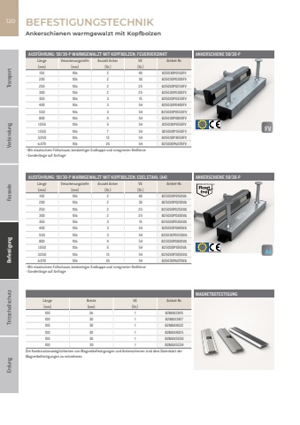 Fassade Befestigung Trittschallschutz Erdung Transport Verbindung120AUSF%u00dcHRUNG: 50/30-P WARMGEWALZT MIT KOPFBOLZEN, FEUERVERZINKTL%u00e4nge Verankerungstiefe Anzahl Anker VE Artikel-Nr.[mm] [mm] [St.] [St.]150 106 2 40 825030P0150FV200 106 2 30 825030P0200FV250 106 2 25 825030P0250FV300 106 2 25 825030P0300FV350 106 3 15 825030P0350FV400 106 3 54 825030P0400FV550 106 3 54 825030P0550FV800 106 4 54 825030P0800FV1.050 106 5 54 825030P1050FV1.550 106 7 54 825030P1550FV3.050 106 13 54 825030P3050FV6.070 106 25 54 825030P6070FV- Mit elastischem F%u00fcllschaum, beidseitiger Endkappe und integrierter Rei%u00dfleine- Sonderl%u00e4nge auf AnfrageAUSF%u00dcHRUNG: 50/30-P WARMGEWALZT MIT KOPFBOLZEN, EDELSTAHL (A4)L%u00e4nge Verankerungstiefe Anzahl Anker VE Artikel-Nr.[mm] [mm] [St.] [St.]150 106 2 40 825030P0150VA200 106 2 30 825030P0200VA250 106 2 25 825030P0250VA300 106 2 25 825030P0300VA350 106 3 15 825030P0350VA400 106 3 54 825030P0400VA550 106 3 54 825030P0550VA800 106 4 54 825030P0800VA1.050 106 5 54 825030P1050VA3.050 106 13 54 825030P3050VA6.070 106 25 54 825030P6070VA- Mit elastischem F%u00fcllschaum, beidseitiger Endkappe und integrierter Rei%u00dfleine- Sonderl%u00e4nge auf AnfrageL%u00e4nge Breite VE Artikel-Nr.[mm] [mm] [St.]100 26 1 82MAX2815100 30 1 82MAX3817100 30 1 82MAX4022100 30 1 82MAX4025100 30 1 82MAX5030100 30 1 82MAX5234Die Kombinationsm%u00f6glichkeiten von Magnetbefestigungen und Ankerschienen sind dem Datenblatt der Magnetbefestigungen zu entnehmen.BEFESTIGUNGSTECHNIKANKERSCHIENE 50/30-PANKERSCHIENE 50/30-PAnkerschienen warmgewalzt mit KopfbolzenMAGNETBEFESTIGUNGFVFVA4A4