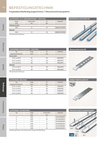 Fassade Befestigung Trittschallschutz Erdung Transport Verbindung124AUSF%u00dcHRUNG: FEUERVERZINKTTyp L%u00e4nge Anzahl Anker Artikel-Nr.[mm] [St.]A 3.000 8 82TS3A300008FVA 3.000 20 82TS3A300020FVB 3.000 8 82TS3B300008FVB 3.000 20 82TS3B300020FVC 3.000 8 82TS3C300008FVC 3.000 20 82TS3C300020FV- Ausf%u00fchrung: Schiene 3 mm, feuerverzinkt, Styropor-Streifenf%u00fcllungAUSF%u00dcHRUNG: 25/15 SENDZIMIRVERZINKT / EDELSTAHLL%u00e4nge Anzahl Anker VE Artikel-Nr.[mm] [St.] [St.]Sendzimirverzinkt2.500 10 40 82MAS25152500SVEdelstahl2.500 10 40 82MAS25152500VA- Mit elastischem F%u00fcllschaumAUSF%u00dcHRUNG: FEUERVERZINKT / EDELSTAHLTyp L%u00e4nge VE Artikel-Nr.[passend f%u00fcr Schiene] [mm] [St.]Feuerverzinkt25/15 und 28/15 85 100 82ML085FV25/15 und 28/15 120 100 82ML120FV25/15 und 28/15 180 100 82ML180FVEdelstahl25/15 und 28/15 120 100 82ML120VA25/15 und 28/15 180 100 82ML180VA- Mit elastischem F%u00fcllschaumAUSF%u00dcHRUNG: EDELSTAHLTyp L%u00e4nge VE Artikel-Nr.[passend f%u00fcr Schiene] [mm] [St.]25/15 und 28/15 120 100 82PB120VA25/15 und 28/15 150 100 82PB150VA25/15 und 28/15 180 100 82PB180VA25/15 und 28/15 240 100 82PB240VABEFESTIGUNGSTECHNIKTRAPEZBLECHBEFESTIGUNGSSCHIENETyp CTyp BTyp ATrapezblechbefestigungsschiene / MaueranschlusssystemMaueranschlussanker MLD%u00dcNNBETTM%u00d6RTELANKER PBMAUERANSCHLUSSSCHIENE MS