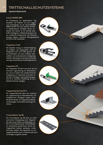 132 TRITTSCHALLSCHUTZSYSTEMESystem%u00fcbersichtSchall-ISODORN HQW%u00aeZur Entkopplung von (gewendelten) Treppenl%u00e4ufen und Podesten als auch Loggien und Laubeng%u00e4ngen ist der Schall-ISODORN HQW%u00aeuniversell und ohne weitere Konsolen in Treppenh%u00e4usern beliebiger Bauart einsetzbar. Das System ist f%u00fcr vertikale Querkr%u00e4fte (aufliegend u. abhebend) geeignet und um zus%u00e4tzliche Komponenten wie H%u00f6henverstellung, Zugdorn, erweiterte Montageabst%u00e4nde bis 120 mm uvm. erweiterbar.Treppendorn PDDer Treppendorn PD dient zum einen der konstruktiven Lagesicherung von Betonelementen und zum anderen der schalltechnischen Entkopplung am Treppenfu%u00df. Einsetzbar ist der Dorn in Fertigteil- sowie Ortbetontreppen und ist in verzinkter Ausf%u00fchrung als auch Edelstahl-Variante verf%u00fcgbar.Treppenfu%u00dfwinkel Typ PD-HDie Treppenfu%u00dfwinkel dient der konstruktiven Lagesicherung von Betonelementen, die schalltechnisch entkoppelt werden sollen. Die Winkel werden am Treppenfu%u00df befestigt, um diese gegen horizontale Einwirkungen zu st%u00fctzen. Trittschallplatte Typ NBDie Trittschallplatte Typ NB dient zur schalltechnischen Entkoppelung eines Treppenfu%u00dfes oder eines Podests zur Bodenplatte. Dabei ist eine Anpassung der Trittschallplatte an verschiedene geometrische Formen des Treppenfu%u00dfes bauseits problemlos mittels Schneiden m%u00f6glich. Das eigentliche, zu entkoppelnde Element kann in Ortbeton oder auch als Fertigteil ausgef%u00fchrt werden.Treppendorn TreDoDie kompakte L%u00f6sung zur Schallentkopplung von Podesten und Treppenl%u00e4ufen stellt der Treppendorn, kurz auch TreDo genannt, dar. Die Kombination aus einem einfachen Querkraftdorn und variantenreichen Auflagerm%u00f6glichkeiten %u00fcberzeugt mit einer guten Schallreduzierung und somit breiten Einsatzm%u00f6glichkeiten.