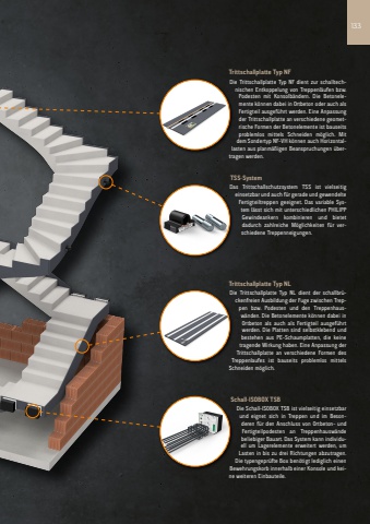 133 TSS-SystemDas Trittschallschutzsystem TSS ist vielseitig einsetzbar und auch f%u00fcr gerade und gewendelte Fertigteiltreppen geeignet. Das variable System l%u00e4sst sich mit unterschiedlichen PHILIPP Gewindeankern kombinieren und bietet dadurch zahlreiche M%u00f6glichkeiten f%u00fcr verschiedene Treppenneigungen.Trittschallplatte Typ NFDie Trittschallplatte Typ NF dient zur schalltechnischen Entkoppelung von Treppenl%u00e4ufen bzw. Podesten mit Konsolb%u00e4ndern. Die Betonelemente k%u00f6nnen dabei in Ortbeton oder auch als Fertigteil ausgef%u00fchrt werden. Eine Anpassung der Trittschallplatte an verschiedene geometrische Formen der Betonelemente ist bauseits problemlos mittels Schneiden m%u00f6glich. Mit dem Sondertyp NF-VH k%u00f6nnen auch Horizontallasten aus planm%u00e4%u00dfigen Beanspruchungen %u00fcbertragen werden. Trittschallplatte Typ NLDie Trittschallplatte Typ NL dient der schallbr%u00fcckenfreien Ausbildung der Fuge zwischen Treppen bzw. Podesten und den Treppenhausw%u00e4nden. Die Betonelemente k%u00f6nnen dabei in Ortbeton als auch als Fertigteil ausgef%u00fchrt werden. Die Platten sind selbstklebend und bestehen aus PE-Schaumplatten, die keine tragende Wirkung haben. Eine Anpassung der Trittschallplatte an verschiedene Formen des Treppenlaufes ist bauseits problemlos mittels Schneiden m%u00f6glich. Schall-ISOBOX TSB Die Schall-ISOBOX TSB ist vielseitig einsetzbar und eignet sich in Treppen und im Besonderen f%u00fcr den Anschluss von Ortbeton- und Fertigteilpodesten an Treppenhausw%u00e4nde beliebiger Bauart. Das System kann individuell um Lagerelemente erweitert werden, um Lasten in bis zu drei Richtungen abzutragen. Die typengepr%u00fcfte Box ben%u00f6tigt lediglich einen Bewehrungskorb innerhalb einer Konsole und keine weiteren Einbauteile.