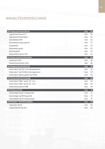 Fassade Befestigung Trittschallschutz Erdung Transport Verbindung Trittschallschutztechnik135TRITTSCHALLSCHUTZSYSTEM TSS Seite 136Lagerelement (Cipremont%u00ae) Seite 136Lagerelement (Compactlager) Seite 136Gewindebolzen S355 Seite 136Gewindebolzen Verg%u00fctungsstahl Seite 137Kompaktanker Seite 137Gewindeanker gerade Seite 137Bewehrungskorb Seite 137Brandschutzmanschette TSS Seite 137TRITTSCHALLSCHUTZSYSTEM TREDO Seite 138Treppendorn TreDo Seite 138Brandschutzmanschette TreDo Seite 138TRITTSCHALLSCHUTZSYSTEM TSB Seite 139Schall-Isobox%u00ae Typ TSB-F (ohne Montagerahmen) Seite 139Schall-Isobox%u00ae Typ TSB-MB (mit Montagerahmen) Seite 139Schall-Isobox%u00ae Bewehrungskorb Typ TSB-BK Seite 139TRITTSCHALLSCHUTZSYSTEM HQW Seite 140Schall-Isodorn%u00ae HQW - Typ 60 %u00d7 40 %u00d7 5 mm Seite 140Schall-Isodorn%u00ae HQW - Typ 60 %u00d7 60 %u00d7 5 mm Seite 140Brandschutzmanschette HQW Seite 140TRITTSCHALLPLATTEN Seite 141Elastomerlager Typ NF-V (Treppenkopf) Seite 141Elastomerlager Typ NB (Treppenfu%u00df) Seite 141Trittschallplatte Typ NL (Treppenwange) Seite 141TREPPENDORN / TREPPENFUSSWINKEL Seite 142Treppendorn Typ PD Seite 142Treppenfu%u00dfwinkel Typ PD-H Seite 142INHALTSVERZEICHNIS
