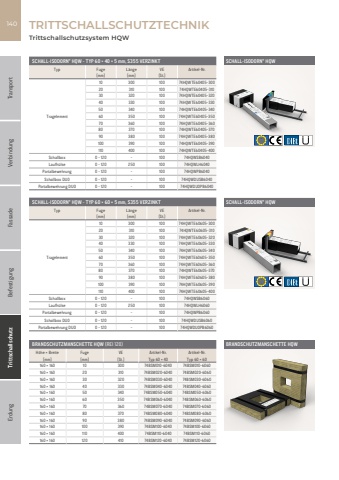 Fassade Befestigung Trittschallschutz Erdung Transport Verbindung140SCHALL-ISODORN%u00ae HQW - TYP 60 %u00d7 40 %u00d7 5mm, S355 VERZINKTTyp Fuge L%u00e4nge VE Artikel-Nr.[mm] [mm] [St.]Tragelement10 300 100 74HQWTE60405-30020 310 100 74HQWTE60405-31030 320 100 74HQWTE60405-32040 330 100 74HQWTE60405-33050 340 100 74HQWTE60405-34060 350 100 74HQWTE60405-35070 360 100 74HQWTE60405-36080 370 100 74HQWTE60405-37090 380 100 74HQWTE60405-380100 390 100 74HQWTE60405-390110 400 100 74HQWTE60405-400Schallbox 0 - 120 - 100 74HQWSB6040Laufh%u00fclse 0 - 120 250 100 74HQWLH6040Portalbewehrung 0 - 120 - 100 74HQWPB6040Schallbox DUO 0 - 120 - 100 74HQWDUSB6040Portalbewehrung DUO 0 - 120 - 100 74HQWDUOPB6040SCHALL-ISODORN%u00ae HQW - TYP 60 %u00d7 60 %u00d7 5mm, S355 VERZINKTTyp Fuge L%u00e4nge VE Artikel-Nr.[mm] [mm] [St.]Tragelement10 300 100 74HQWTE60605-30020 310 100 74HQWTE60605-31030 320 100 74HQWTE60605-32040 330 100 74HQWTE60605-33050 340 100 74HQWTE60605-34060 350 100 74HQWTE60605-35070 360 100 74HQWTE60605-36080 370 100 74HQWTE60605-37090 380 100 74HQWTE60605-380100 390 100 74HQWTE60605-390110 400 100 74HQWTE60605-400Schallbox 0 - 120 - 100 74HQWSB6060Laufh%u00fclse 0 - 120 250 100 74HQWLH6060Portalbewehrung 0 - 120 - 100 74HQWPB6060Schallbox DUO 0 - 120 - 100 74HQWDUSB6060Portalbewehrung DUO 0 - 120 - 100 74HQWDUOPB6060BRANDSCHUTZMANSCHETTE HQW (REI 120)H%u00f6he %u00d7 Breite Fuge VE Artikel-Nr. Artikel-Nr.[mm] [mm] [St.] Typ 60 %u00d7 40 Typ 60 %u00d7 60160 %u00d7 160 10 300 74BSM010-6040 74BSM010-6060160 %u00d7 160 20 310 74BSM020-6040 74BSM020-6060160 %u00d7 160 30 320 74BSM030-6040 74BSM030-6060160 %u00d7 160 40 330 74BSM040-6040 74BSM040-6060160 %u00d7 160 50 340 74BSM050-6040 74BSM050-6060160 %u00d7 160 60 350 74BSM060-6040 74BSM060-6060160 %u00d7 160 70 360 74BSM070-6040 74BSM070-6060160 %u00d7 160 80 370 74BSM080-6040 74BSM080-6060160 %u00d7 160 90 380 74BSM090-6040 74BSM090-6060160 %u00d7 160 100 390 74BSM100-6040 74BSM100-6060160 %u00d7 160 110 400 74BSM110-6040 74BSM110-6060160 %u00d7 160 120 410 74BSM120-6040 74BSM120-6060TRITTSCHALLSCHUTZTECHNIKTrittschallschutzsystem HQWBRANDSCHUTZMANSCHETTE HQWSCHALL-ISODORN%u00ae HQWSCHALL-ISODORN%u00ae HQW