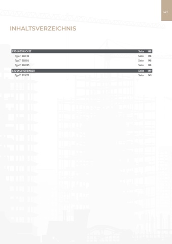 Fassade Befestigung Trittschallschutz Erdung Transport Verbindung Erdungstechnik147ERDUNGSBUCHSE Seite 148Typ 71 EB F40 Seite 148Typ 71 EB B16 Seite 148Typ 71 EB K95 Seite 148ERDUNGSVERBINDER Seite 149Typ 71 EV K70 Seite 149INHALTSVERZEICHNIS