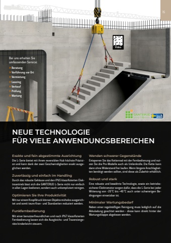 15Bei uns erhalten Sieumfassenden Service:%u00bb Beratung%u00bb Vorf%u00fchrung vor Ort%u00bb Vermietung%u00bb Leasing%u00bb Verkauf%u00bb Pr%u00fcfung%u00bb WartungNEUE TECHNOLOGIEF%u00dcR VIELE ANWENDUNGSBEREICHENExakte und fein abgestimmte AusrichtungDie L-Serie bietet mit ihrem reversiblen Hub h%u00f6chste Pr%u00e4zision und kann dank der zwei Geschwindigkeiten exakt ausgeglichen werden.Zuverl%u00e4ssig und einfach im HandlingDurch das robuste Geh%u00e4use und den IP65 klassifizierten Elektroantrieb l%u00e4sst sich die GANTERUD L-Serie nicht nur einfach in allen Lagen bedienen, sondern auch unkompliziert reinigen.Optimieren Sie Ihre Produktivit%u00e4tMit nur einem Knopfdruck k%u00f6nnen Objekte m%u00fchelos ausgerichtet und somit teure Kran- und Standzeiten reduziert werden.FunkfernbedienungMit einer benutzerfreundlichen und nach IP67 klassifizierten Fernbedienung lassen sich die Ausgleichs- und Traversierger%u00e4te kinderleicht steuern.Wenden schwerer Gegenst%u00e4ndeEntsperren Sie das Kettenrad mit der Fernbedienung und nutzen Sie die Pro-Modelle auch als Umlenkrolle. Die Kette kann dann ohne Widerstand frei laufen. Wenn l%u00e4ngere Anschlagketten ben%u00f6tigt werden sollten, sind diese als Zubeh%u00f6r erh%u00e4ltlich.Robust und starkEine robuste und bew%u00e4hrte Technologie, sowie ein betriebssicherer Elektromotor sorgen daf%u00fcr, dass die L-Serie bei jeder Witterung von -20 %u00b0C bis +40 %u00b0C auch unter schwierigen Bedingungen einsetzbar ist.Minimaler WartungsbedarfNeben einer regelm%u00e4%u00dfigen Reinigung muss lediglich auf die Akkuladung geachtet werden - diese kann direkt hinter der Wartungsklappe abgelesen werden.Video