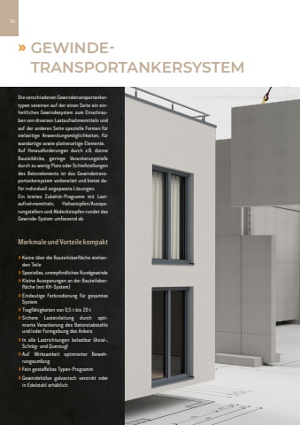 Fassade Befestigung Trittschallschutz Erdung Transport Verbindung16%u00bb GEWINDETRANSPORTANKERSYSTEMDie verschiedenen Gewindetransportankertypen vereinen auf der einen Seite ein einheitliches Gewindesystem zum Einschrauben von diversen Lastaufnahmemitteln und auf der anderen Seite spezielle Formen f%u00fcr vielseitige Anwendungsm%u00f6glichkeiten, f%u00fcr wandartige sowie plattenartige Elemente.Auf Herausforderungen durch z.B. d%u00fcnne Bauteildicke, geringe Verankerungstiefe durch zu wenig Platz oder Schiefstellungen des Betonelements ist das Gewindetransportankersystem vorbereitet und bietet daf%u00fcr individuell angepasste L%u00f6sungen.Ein breites Zubeh%u00f6r-Programm mit Lastaufnahmemitteln, Haltestopfen/Aussparungstellern und Abdeckstopfen rundet das Gewinde-System umfassend ab.Merkmale und Vorteile kompakt%u00bb Keine %u00fcber die Bauteiloberfl%u00e4che stehenden Teile%u00bb Spezielles, unempfindliches Rundgewinde%u00bb Kleine Aussparungen an der Bauteiloberfl%u00e4che (mit KH-System)%u00bb Eindeutige Farbcodierung f%u00fcr gesamtes System%u00bb Tragf%u00e4higkeiten von 0,5 t bis 20 t%u00bb Sichere Lasteinleitung durch optimierte Verankerung des Betonstabstahlsund/oder Formgebung des Ankers%u00bb In alle Lastrichtungen belastbar (Axial-, Schr%u00e4g- und Querzug) %u00bb Auf Wirksamkeit optimierter Bewehrungsumfang%u00bb Fein gestaffeltes Typen-Programm%u00bb Gewindeh%u00fclse galvanisch verzinkt oder in Edelstahl erh%u00e4ltlich
