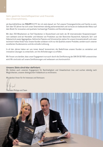 2 Sehr geehrte Gesch%u00e4ftspartner und Freundedes Unternehmens,als Gesch%u00e4ftsf%u00fchrer der PHILIPPGRUPPE bin ich stolz darauf, ein Teil unserer Firmengeschichte und Familie zu sein. Seit %u00fcber 50 Jahren hat sich unser Unternehmen st%u00e4ndig weiterentwickelt und ist heute ein bedeutender Akteur auf dem Markt f%u00fcr innovative und qualitativ hochwertige Produkte und Dienstleistungen.Mit %u00fcber 250 Mitarbeitern an f%u00fcnf Standorten in Deutschland und mehr als 30 internationalen Kooperationspartnern weltweit sind wir Hersteller und Anbieter von Produkten aus den Bereichen Bautechnik, Hydraulik, Seil- und Hebetechnik sowie Aggregatbau. Zahlreiche Patente und Schutzrechte stehen f%u00fcr unsere Innovationskraft und unser technisch hohes Know-how. Unsere Kunden sch%u00e4tzen nicht nur die Qualit%u00e4t unserer Produkte, sondern auch unseren exzellenten Kundenservice und die schnelle Lieferung.In all den Jahren haben wir uns immer darauf konzentriert, die Bed%u00fcrfnisse unserer Kunden zu verstehen und innovative L%u00f6sungen zu entwickeln, um ihre Anforderungen zu erf%u00fcllen. Wir freuen uns dar%u00fcber, dass unser Engagement nun auch durch die Zertifizierung der DIN EN ISO 9001 unterstrichen wird. Wir sind stolz auf unsere Zertifizierungen und verbessern uns kontinuierlich.Unsere Ziele sind klar definiert:Wir bleiben auch unserem Engagement f%u00fcr Nachhaltigkeit und Umweltschutz treu und suchen st%u00e4ndig nach M%u00f6glichkeiten, unseren %u00f6kologischen Fu%u00dfabdruck zu minimieren. Wir danken Ihnen f%u00fcr Ihr Interesse und Vertrauen.Thorsten Philipp und Team