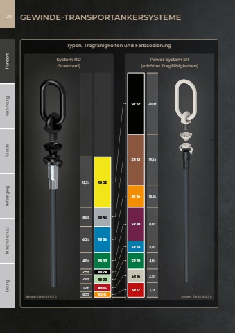 Fassade Befestigung Trittschallschutz Erdung Transport Verbindung20 %u0007GEWINDE-TRANSPORTANKERSYSTEMERD 12RD 16RD 20RD 24RD 30RD 36RD 42RD 52SR 12SR 16SR 20SR 36SR 42SR 30SR 520.5 t1.2 t2.0 t2.5 t4.0 t6.3 t8.0 t12.5 t1.3 t2.5 t4.0 t10.0 t14.5t8.0 t20.0 tSR 24 5.0 tRD 12RD 16RD 20RD 24RD 30RD 36RD 42RD 52SR 12SR 16SR 20SR 36SR 42SR 30SR 520,5 t1,2 t2,0 t2,5 t4,0 t6,3 t8,0 t12,5 t1,3 t2,5 t4,0 t10,0 t14,5t8,0 t20,0 tSR 24 5,0 tTypen, Tragf%u00e4higkeiten und FarbcodierungSystem RD(Standard)Power System SR(erh%u00f6hte Tragf%u00e4higkeiten)Beispiel: Typ RD 24 (2,5 t) Beispiel: Typ SR 16 (2,5 t)