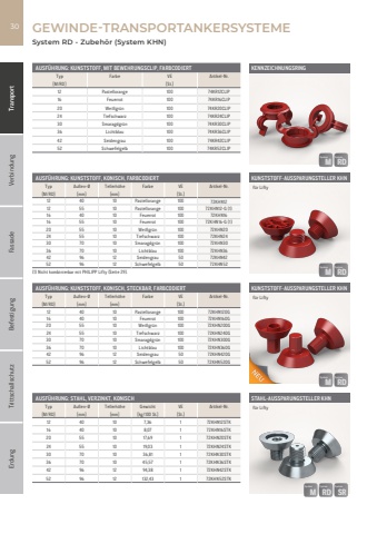 Fassade Befestigung Trittschallschutz Erdung Transport Verbindung30AUSF%u00dcHRUNG: KUNSTSTOFF, KONISCH, FARBCODIERTTyp Au%u00dfen-%u00d8 Tellerh%u00f6he Farbe VE Artikel-Nr.[M/RD] [mm] [mm] [St.]12 40 10 Pastellorange 100 72KHN1212 55 10 Pastellorange 100 72KHN12-G (1)16 40 10 Feuerrot 100 72KHN1616 55 10 Feuerrot 100 72KHN16-G (1)20 55 10 Wei%u00dfgr%u00fcn 100 72KHN2024 55 10 Tiefschwarz 100 72KHN2430 70 10 Smaragdgr%u00fcn 100 72KHN3036 70 10 Lichtblau 100 72KHN3642 96 12 Seidengrau 50 72KHN4252 96 12 Schwefelgelb 50 72KHN52(1) Nicht kombinierbar mit PHILIPP Lifty (Seite 29).AUSF%u00dcHRUNG: STAHL, VERZINKT, KONISCHTyp Au%u00dfen-%u00d8 Tellerh%u00f6he Gewicht VE Artikel-Nr.[M/RD] [mm] [mm] [kg/100 St.] [St.]12 40 10 7,36 1 72KHN12STK16 40 10 8,07 1 72KHN16STK20 55 10 17,69 1 72KHN20STK24 55 10 19,03 1 72KHN24STK30 70 10 36,81 1 72KHN30STK36 70 10 45,57 1 72KHN36STK42 96 12 94,38 1 72KHN42STK52 96 12 132,43 1 72KHN52STKAUSF%u00dcHRUNG: KUNSTSTOFF, KONISCH, STECKBAR, FARBCODIERTTyp Au%u00dfen-%u00d8 Tellerh%u00f6he Farbe VE Artikel-Nr.[M/RD] [mm] [mm] [St.]12 40 10 Pastellorange 100 72KHN12OG16 40 10 Feuerrot 100 72KHN16OG20 55 10 Wei%u00dfgr%u00fcn 100 72KHN20OG24 55 10 Tiefschwarz 100 72KHN24OG30 70 10 Smaragdgr%u00fcn 100 72KHN30OG36 70 10 Lichtblau 100 72KHN36OG42 96 12 Seidengrau 50 72KHN42OG52 96 12 Schwefelgelb 50 72KHN52OGAUSF%u00dcHRUNG: KUNSTSTOFF, MIT BEWEHRUNGSCLIP, FARBCODIERTTyp Farbe VE Artikel-Nr.[M/RD] [St.]12 Pastellorange 100 74KR12CLIP16 Feuerrot 100 74KR16CLIP20 Wei%u00dfgr%u00fcn 100 74KR20CLIP24 Tiefschwarz 100 74KR24CLIP30 Smaragdgr%u00fcn 100 74KR30CLIP36 Lichtblau 100 74KR36CLIP42 Seidengrau 100 74KR42CLIP52 Schwefelgelb 100 74KR52CLIP%u0007GEWINDE-TRANSPORTANKERSYSTEMEKUNSTSTOFF-AUSSPARUNGSTELLER KHNf%u00fcr LiftySystem RD - Zubeh%u00f6r (System KHN)STAHL-AUSSPARUNGSTELLER KHNf%u00fcr LiftyKUNSTSTOFF-AUSSPARUNGSTELLER KHNf%u00fcr LiftyKENNZEICHNUNGSRINGRDRDSystemMMSystemRDRDSystemMMSystemSRSRSystemRDRDSystemMMSystemRDRDSystemMMSystem