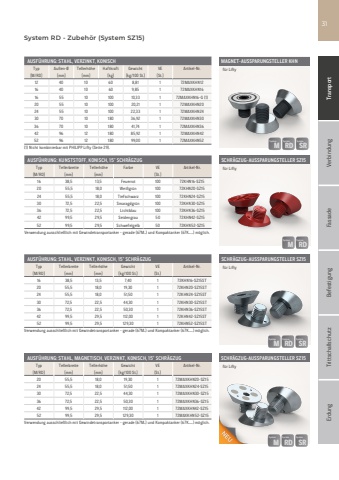 Fassade Befestigung Trittschallschutz Erdung Transport Verbindung31AUSF%u00dcHRUNG: STAHL, VERZINKT, KONISCHTyp Au%u00dfen-%u00d8 Tellerh%u00f6he Haftkraft Gewicht VE Artikel-Nr.[M/RD] [mm] [mm] [kg] [kg/100 St.] [St.]12 40 10 60 8,81 1 72MAXKHN1216 40 10 60 9,85 1 72MAXKHN1616 55 10 100 10,33 1 72MAXKHN16-G (1)20 55 10 100 20,21 1 72MAXKHN2024 55 10 100 22,33 1 72MAXKHN2430 70 10 180 36,92 1 72MAXKHN3036 70 10 180 41,74 1 72MAXKHN3642 96 12 180 85,92 1 72MAXKHN4252 96 12 180 99,00 1 72MAXKHN52(1) Nicht kombinierbar mit PHILIPP Lifty (Seite 29).AUSF%u00dcHRUNG: KUNSTSTOFF, KONISCH, 15%u00b0 SCHR%u00c4GZUGTyp Tellerbreite Tellerh%u00f6he Farbe VE Artikel-Nr.[M/RD] [mm] [mm] [St.]16 38,5 13,5 Feuerrot 100 72KHN16-SZ1520 55,5 18,0 Wei%u00dfgr%u00fcn 100 72KHN20-SZ1524 55,5 18,0 Tiefschwarz 100 72KHN24-SZ1530 72,5 22,5 Smaragdgr%u00fcn 100 72KHN30-SZ1536 72,5 22,5 Lichtblau 100 72KHN36-SZ1542 99,5 29,5 Seidengrau 50 72KHN42-SZ1552 99,5 29,5 Schwefelgelb 50 72KHN52-SZ15Verwendung ausschlie%u00dflich mit Gewindetransportanker - gerade (67M..) und Kompaktanker (67K......) m%u00f6glich.AUSF%u00dcHRUNG: STAHL, VERZINKT, KONISCH, 15%u00b0 SCHR%u00c4GZUGTyp Tellerbreite Tellerh%u00f6he Gewicht VE Artikel-Nr.[M/RD] [mm] [mm] [kg/100 St.] [St.]16 38,5 13,5 7,40 1 72KHN16-SZ15ST20 55,5 18,0 19,30 1 72KHN20-SZ15ST24 55,5 18,0 51,50 1 72KHN24-SZ15ST30 72,5 22,5 44,30 1 72KHN30-SZ15ST36 72,5 22,5 50,30 1 72KHN36-SZ15ST42 99,5 29,5 112,00 1 72KHN42-SZ15ST52 99,5 29,5 129,30 1 72KHN52-SZ15STVerwendung ausschlie%u00dflich mit Gewindetransportanker - gerade (67M..) und Kompaktanker (67K......) m%u00f6glich.AUSF%u00dcHRUNG: STAHL, MAGNETISCH, VERZINKT, KONISCH, 15%u00b0 SCHR%u00c4GZUGTyp Tellerbreite Tellerh%u00f6he Gewicht VE Artikel-Nr.[M/RD] [mm] [mm] [kg/100 St.] [St.]20 55,5 18,0 19,30 1 72MAXKHN20-SZ1524 55,5 18,0 51,50 1 72MAXKHN24-SZ1530 72,5 22,5 44,30 1 72MAXKHN30-SZ1536 72,5 22,5 50,30 1 72MAXKHN36-SZ1542 99,5 29,5 112,00 1 72MAXKHN42-SZ1552 99,5 29,5 129,30 1 72MAXKHN52-SZ15Verwendung ausschlie%u00dflich mit Gewindetransportanker - gerade (67M..) und Kompaktanker (67K......) m%u00f6glich.MAGNET-AUSSPARUNGSTELLER KHNf%u00fcr LiftySCHR%u00c4GZUG-AUSSPARUNGSTELLER SZ15f%u00fcr LiftySCHR%u00c4GZUG-AUSSPARUNGSTELLER SZ15f%u00fcr LiftySystem RD - Zubeh%u00f6r (System SZ15)SCHR%u00c4GZUG-AUSSPARUNGSTELLER SZ15f%u00fcr LiftySRSRSystemRDRDSystemMMSystemRDRDSystemMMSystemSRSRSystemRDRDSystemMMSystemSRSRSystemRDRDSystemMMSystem