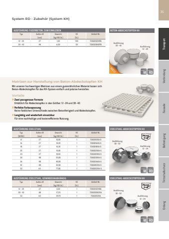 Fassade Befestigung Trittschallschutz Erdung Transport Verbindung35AUSF%u00dcHRUNG: FASERBETON, ZUM EINKLEBENTyp Au%u00dfen-%u00d8 Gewicht VE Artikel-Nr.[mm] [kg/100 St.] [St.]12 - 24 27 1,40 100 72ASO1224FB30 - 42 48 6,50 50 72ASO3042FBAUSF%u00dcHRUNG: EDELSTAHLTyp Au%u00dfen-%u00d8 Gewicht VE Artikel-Nr.[M/RD] [mm] [kg/100 St.] [St.]12 27 10,00 1 72ASO12VA-S16 27 10,20 1 72ASO16VA-S18 27 10,30 1 72ASO18VA-S20 27 10,40 1 72ASO20VA-S24 27 10,50 1 72ASO24VA-S30 48 35,00 1 72ASO30VA-S36 48 40,00 1 72ASO36VA-S42 48 42,00 1 72ASO42VA-S52 65 77,00 1 72ASO52VA-SAUSF%u00dcHRUNG: EDELSTAHL, GEWINDEUNABH%u00c4NGIGTyp Au%u00dfen-%u00d8 Gewicht VE Artikel-Nr.[mm] [kg/100 St.] [St.]12 - 24 27 4,30 1 72ASO1224VA30 - 42 48 17,20 1 72ASO3042VA52 65 39,70 1 72ASO52VABETON-ABDECKSTOPFEN KHAusf%u00fchrung 30 - 42 Ausf%u00fchrung 12 - 24EDELSTAHL-ABDECKSTOPFEN KHAusf%u00fchrung 30 - 52Ausf%u00fchrung 12 - 24EDELSTAHL-ABDECKSTOPFEN KHAusf%u00fchrung 30 - 52Ausf%u00fchrung 12 - 24System RD - Zubeh%u00f6r (System KH)RDRDSystemMMSystemRDRDSystemMMSystemRDRDSystemMMSystemMatrizen zur Herstellung von Beton-Abdeckstopfen KHMit unseren hochwertigen Matrizen aus einem gummi%u00e4hnlichen Material lassen sich Beton-Abdeckstopfen f%u00fcr das KH-System einfach und pr%u00e4zise herstellen.Vorteile%u00bb Zwei passgenaue FormateErh%u00e4ltlich f%u00fcr Abdeckstopfen in den Gr%u00f6%u00dfen 12 - 24 und 30 - 42.%u00bb Perfekte FarbanpassungKeine farblichen Unterschiede zwischen Betonfertigteil und Abdeckstopfen.%u00bb Langlebig und wiederholt einsetzbarF%u00fcr eine nachhaltige und kosteneffiziente Nutzung.