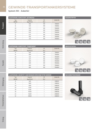 Fassade Befestigung Trittschallschutz Erdung Transport Verbindung38AUSF%u00dcHRUNG: GEH%u00c4RTET, ZUM REINIGEN VERSCHMUTZTER GEWINDETyp Gewicht VE Artikel-Nr.[M/RD] [kg/100 St.] [St.]12 4,00 1 61NAS1216 10,00 1 61NAS1620 18,00 1 61NAS2024 33,00 1 61NAS2430 63,00 1 61NAS3036 103,00 1 61NAS3642 146,00 1 61NAS4252 289,00 1 61NAS52AUSF%u00dcHRUNG: KUNSTSTOFF, BETONGRAUTyp Gewicht VE Artikel-Nr.[M/RD] [kg/100 St.] [St.]12 0,06 100 72ASS1216 0,14 100 72ASS1620 0,29 100 72ASS2024 0,38 100 72ASS2430 0,53 100 72ASS3036 0,73 100 72ASS3642 0,96 100 72ASS4252 1,33 100 72ASS52AUSF%u00dcHRUNG: KUNSTSTOFF, TRANSPARENTTyp Gewicht VE Artikel-Nr.[M/RD] [kg/100 St.] [St.]12 0,07 100 72KAS1216 0,09 100 72KAS1620 0,14 100 72KAS2024 0,21 100 72KAS2430 0,40 100 72KAS3036 0,40 100 72KAS3642 0,63 100 72KAS4252 0,69 100 72KAS52%u0007GEWINDE-TRANSPORTANKERSYSTEMENACHARBEITSSCHRAUBESystem RD - Zubeh%u00f6rAUSSENSTOPFENABDECKSTOPFENSRSRSystemRDRDSystemMMSystemSLSLSystemSRSRSystemRDRDSystemMMSystemSLSLSystemSRSRSystemRDRDSystemMMSystem