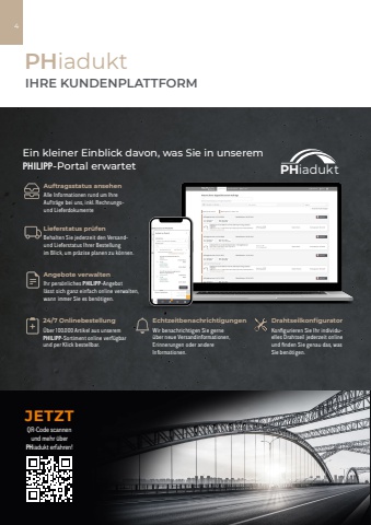 4Ein kleiner Einblick davon, was Sie in unserem PHILIPP-Portal erwartetJETZTQR-Code scannen und mehr %u00fcber PHiadukt erfahren!IHRE KUNDENPLATTFORMPHILIPP PHILIPPGRUPPE GROUPPHiaduktAuftragsstatus ansehenAlle Informationen rund um Ihre Auftr%u00e4ge bei uns, inkl. Rechnungsund LieferdokumenteLieferstatus pr%u00fcfenBehalten Sie jederzeit den Versandund Lieferstatus Ihrer Bestellung im Blick, um pr%u00e4zise planen zu k%u00f6nnen.Angebote verwaltenIhr pers%u00f6nliches PHILIPP-Angebot l%u00e4sst sich ganz einfach online verwalten, wann immer Sie es ben%u00f6tigen.24/7 Onlinebestellung%u00dcber 100.000 Artikel aus unserem PHILIPP-Sortiment online verf%u00fcgbar und per Klick bestellbar.EchtzeitbenachrichtigungenWir benachrichtigen Sie gerne %u00fcber neue Versandinformationen, Erinnerungen oder andere Informationen.DrahtseilkonfiguratorKonfigurieren Sie Ihr individuelles Drahtseil jederzeit online und finden Sie genau das, was Sie ben%u00f6tigen.PHiadukt