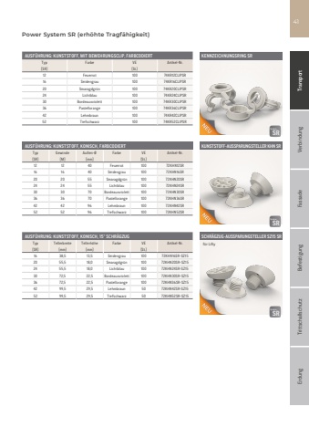Fassade Befestigung Trittschallschutz Erdung Transport Verbindung41AUSF%u00dcHRUNG: KUNSTSTOFF, MIT BEWEHRUNGSCLIP, FARBCODIERTTyp Farbe VE Artikel-Nr.[SR] [St.]12 Feuerrot 100 74KR12CLIPSR16 Seidengrau 100 74KR16CLIPSR20 Smaragdgr%u00fcn 100 74KR20CLIPSR24 Lichtblau 100 74KR24CLIPSR30 Bordeauxviolett 100 74KR30CLIPSR36 Pastellorange 100 74KR36CLIPSR42 Lehmbraun 100 74KR42CLIPSR52 Tiefschwarz 100 74KR52CLIPSRAUSF%u00dcHRUNG: KUNSTSTOFF, KONISCH, FARBCODIERTTyp Gewinde Au%u00dfen-%u00d8 Farbe VE Artikel-Nr.[SR] [M] [mm] [St.]12 12 40 Feuerrot 100 72KHN12SR16 16 40 Seidengrau 100 72KHN16SR20 20 55 Smaragdgr%u00fcn 100 72KHN20SR24 24 55 Lichtblau 100 72KHN24SR30 30 70 Bordeauxviolett 100 72KHN30SR36 36 70 Pastellorange 100 72KHN36SR42 42 96 Lehmbraun 100 72KHN42SR52 52 96 Tiefschwarz 100 72KHN52SRAUSF%u00dcHRUNG: KUNSTSTOFF, KONISCH, 15%u00b0 SCHR%u00c4GZUGTyp Tellerbreite Tellerh%u00f6he Farbe VE Artikel-Nr.[SR] [mm] [mm] [St.]16 38,5 13,5 Seidengrau 100 72KHN16SR-SZ1520 55,5 18,0 Smaragdgr%u00fcn 100 72KHN20SR-SZ1524 55,5 18,0 Lichtblau 100 72KHN24SR-SZ1530 72,5 22,5 Bordeauxviolett 100 72KHN30SR-SZ1536 72,5 22,5 Pastellorange 100 72KHN36SR-SZ1542 99,5 29,5 Lehmbraun 50 72KHN42SR-SZ1552 99,5 29,5 Tiefschwarz 50 72KHN52SR-SZ15KENNZEICHNUNGSRING SRKUNSTSTOFF-AUSSPARUNGSTELLER KHN SRPower System SR (erh%u00f6hte Tragf%u00e4higkeit)SCHR%u00c4GZUG-AUSSPARUNGSTELLER SZ15 SRf%u00fcr LiftySRSRSystemSRSRSystemSRSRSystem
