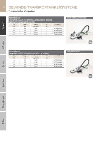 Fassade Befestigung Trittschallschutz Erdung Transport Verbindung44BESTEHEND AUS:TRANSPORTSCHLAUFE, TRANSPORTSCHLAUFENANKER (RD-GEWINDE),SECHSKANTSCHRAUBE 8.8 (M-GEWINDE)Typ L%u00e4nge Gewicht VE Artikel-Nr.[TPS] [mm] [kg/100 St.] [St.]16 280 79,00 1 67TPSS12200024 310 172,00 1 67TPSS15400030 390 343,00 1 67TPSS18520036 525 434,00 1 67TPSS206300BESTEHEND AUS: TRANSPORTSCHLAUFE, SECHSKANTSCHRAUBE 8.8 (M-GEWINDE)Typ L%u00e4nge Gewicht VE Artikel-Nr.[TPS] [mm] [kg/100 St.] [St.]16 280 66,00 1 67TPS122000S24 310 134,00 1 67TPS154000S30 390 242,00 1 67TPS185200S36 525 321,00 1 67TPS206300S%u0007GEWINDE-TRANSPORTANKERSYSTEMETRANSPORTSCHLAUFENSYSTEMTRANSPORTSCHLAUFETransportschlaufensystemTPS TPSSystemTPS TPSSystem