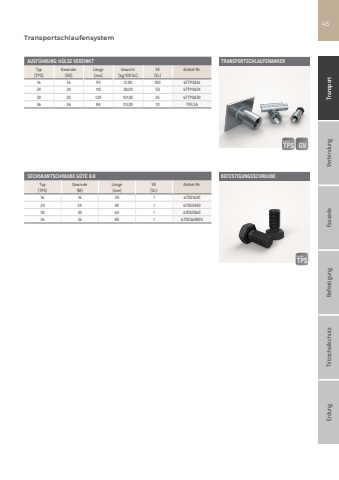 Fassade Befestigung Trittschallschutz Erdung Transport Verbindung45AUSF%u00dcHRUNG: H%u00dcLSE VERZINKTTyp Gewinde L%u00e4nge Gewicht VE Artikel-Nr.[TPS] [RD] [mm] [kg/100 St.] [St.]16 16 95 12,00 100 67TPSA1624 24 110 38,00 50 67TPSA2430 30 120 101,00 25 67TPSA3036 36 84 113,00 10 71FL36SECHSKANTSCHRAUBE G%u00dcTE 8.8Typ Gewinde L%u00e4nge VE Artikel-Nr.[TPS] [M] [mm] [St.]16 16 30 1 670S163024 24 40 1 670S244030 30 60 1 670S306036 36 80 1 670S36080VTRANSPORTSCHLAUFENANKERBEFESTIGUNGSSCHRAUBETransportschlaufensystemGVGVTPS TPSSystemTPS TPSSystem