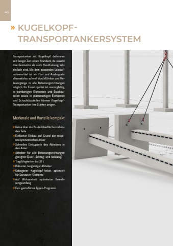 Fassade Befestigung Trittschallschutz Erdung Transport Verbindung46%u00bb KUGELKOPFTRANSPORTANKERSYSTEMTransportanker mit Kugelkopf definieren seit langer Zeit einen Standard, da sowohl ihre Geometrie als auch Handhabung sehr einfach sind. Mit dem passenden Lastaufnahmemittel ist ein Ein- und Auskuppeln alternativlos schnell durchf%u00fchrbar und Hebevorg%u00e4nge in alle Belastungsrichtungen m%u00f6glich. Ihr Einsatzgebiet ist mannigfaltig, in wandartigen Elementen und Stabbauteilen sowie in plattenartigen Elementen und Schachtbauteilen k%u00f6nnen KugelkopfTransportanker ihre St%u00e4rken zeigen.Merkmale und Vorteile kompakt%u00bb Keine %u00fcber die Bauteiloberfl%u00e4che stehenden Teile%u00bb Einfacher Einbau auf Grund der rotationssymmetrischen Anker%u00bb Schnelles Einkuppeln des Abhebers in den Anker%u00bb Abheber f%u00fcr alle Belastungsrichtungen geeignet (Quer-, Schr%u00e4g- und Axialzug)%u00bb Tragf%u00e4higkeiten bis 32 t%u00bb Robuster, langlebiger Abheber%u00bb Gebogener Kugelkopf-Anker, optimiert f%u00fcr Sandwich-Elemente%u00bb Auf Wirksamkeit optimierter Bewehrungsumfang%u00bb Fein gestaffeltes Typen-Programm