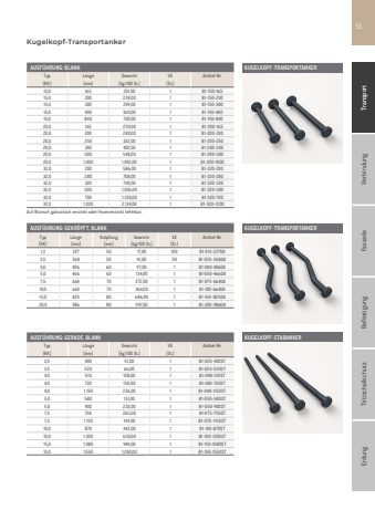 Fassade Befestigung Trittschallschutz Erdung Transport Verbindung51AUSF%u00dcHRUNG: GEKR%u00d6PFT, BLANKTyp L%u00e4nge Kr%u00f6pfung Gewicht VE Artikel-Nr.[KK] [mm] [mm] [kg/100 St.] [St.]1,3 227 50 17,00 100 81-013-227GK2,5 268 50 41,00 50 81-025-268GK4,0 406 60 97,00 1 81-040-406GK5,0 466 60 134,00 1 81-050-466GK7,5 664 70 272,00 1 81-075-664GK10,0 664 70 364,00 1 81-100-664GK15,0 825 80 686,00 1 81-150-825GK20,0 986 80 997,00 1 81-200-986GKAUSF%u00dcHRUNG: GERADE, BLANKTyp L%u00e4nge Gewicht VE Artikel-Nr.[KK] [mm] [kg/100 St.] [St.]2,5 400 51,00 1 81-025-400ST2,5 520 66,00 1 81-025-520ST4,0 510 108,00 1 81-040-510ST4,0 720 150,00 1 81-040-720ST4,0 1.150 226,00 1 81-040-1150ST5,0 580 151,00 1 81-050-580ST5,0 900 230,00 1 81-050-900ST7,5 750 265,00 1 81-075-750ST7,5 1.150 419,00 1 81-075-1150ST10,0 870 442,00 1 81-100-870ST10,0 1.300 650,00 1 81-100-1300ST15,0 1.080 940,00 1 81-150-1080ST15,0 1.550 1.280,00 1 81-150-1550STAUSF%u00dcHRUNG: BLANKTyp L%u00e4nge Gewicht VE Artikel-Nr.[KK] [mm] [kg/100 St.] [St.]15,0 165 201,00 1 81-150-16515,0 200 228,00 1 81-150-20015,0 300 299,00 1 81-150-30015,0 400 369,00 1 81-150-40015,0 840 700,00 1 81-150-84020,0 165 259,00 1 81-200-16520,0 200 280,00 1 81-200-20020,0 250 322,00 1 81-200-25020,0 340 402,00 1 81-200-34020,0 500 548,00 1 81-200-50020,0 1.000 1.092,00 1 81-200-100032,0 200 586,00 1 81-320-20032,0 280 708,00 1 81-320-28032,0 320 740,00 1 81-320-32032,0 500 1.036,00 1 81-320-50032,0 700 1.330,00 1 81-320-70032,0 1.200 2.134,00 1 81-320-1200Auf Wunsch galvanisch verzinkt oder feuerverzinkt lieferbar.KUGELKOPF-TRANSPORTANKERKUGELKOPF-TRANSPORTANKERKUGELKOPF-STABANKERKugelkopf-Transportanker