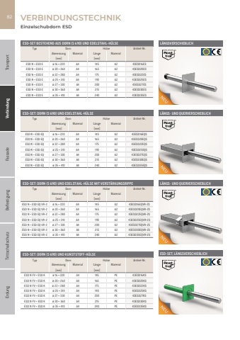 Fassade Befestigung Trittschallschutz Erdung Transport Verbindung82ESD-SET BESTEHEND AUS DORN (S 690) UND EDELSTAHL-H%u00dcLSE Typ Dorn H%u00fclse Artikel-Nr.Abmessung Material L%u00e4nge Material[mm] [mm]ESD N + ESD E %u00f8 16 %u00d7 220 A4 145 A2 43ESD16ESESD N + ESD E %u00f8 20 %u00d7 260 A4 165 A2 43ESD20ESESD N + ESD E %u00f8 22 %u00d7 280 A4 175 A2 43ESD22ESESD N + ESD E %u00f8 25 %u00d7 310 A4 190 A2 43ESD25ESESD N + ESD E %u00f8 27 %u00d7 330 A4 200 A2 43ESD27ESESD N + ESD E %u00f8 30 %u00d7 360 A4 215 A2 43ESD30ESESD N + ESD E %u00f8 35 %u00d7 410 A4 240 A2 43ESD35ESESD-SET: DORN (S 690) UND EDELSTAHL-H%u00dcLSETyp Dorn H%u00fclse Artikel-Nr.Abmessung Material L%u00e4nge Material[mm] [mm]ESD N + ESD EQ %u00f8 16 %u00d7 220 A4 145 A2 43ESD16EQSESD N + ESD EQ %u00f8 20 %u00d7 260 A4 165 A2 43ESD20EQSESD N + ESD EQ %u00f8 22 %u00d7 280 A4 175 A2 43ESD22EQSESD N + ESD EQ %u00f8 25 %u00d7 310 A4 190 A2 43ESD25EQSESD N + ESD EQ %u00f8 27 %u00d7 330 A4 200 A2 43ESD27EQSESD N + ESD EQ %u00f8 30 %u00d7 360 A4 215 A2 43ESD30EQSESD N + ESD EQ %u00f8 35 %u00d7 410 A4 240 A2 43ESD35EQSESD-SET: DORN (S 690) UND EDELSTAHL-H%u00dcLSE MIT VERST%u00c4RKUNGSRIPPETyp Dorn H%u00fclse Artikel-Nr.Abmessung Material L%u00e4nge Material[mm] [mm]ESD N + ESD EQ VR-2 %u00f8 16 %u00d7 220 A4 145 A2 43ESD16EQVR-2SESD N + ESD EQ VR-2 %u00f8 20 %u00d7 260 A4 165 A2 43ESD20EQVR-2SESD N + ESD EQ VR-2 %u00f8 22 %u00d7 280 A4 175 A2 43ESD22EQVR-2SESD N + ESD EQ VR-2 %u00f8 25 %u00d7 310 A4 190 A2 43ESD25EQVR-2SESD N + ESD EQ VR-2 %u00f8 27 %u00d7 330 A4 200 A2 43ESD27EQVR-2SESD N + ESD EQ VR-2 %u00f8 30 %u00d7 360 A4 215 A2 43ESD30EQVR-2SESD N + ESD EQ VR-2 %u00f8 35 %u00d7 410 A4 240 A2 43ESD35EQVR-2SESD-SET: DORN (S 690) UND KUNSTSTOFF-H%u00dcLSETyp Dorn H%u00fclse Artikel-Nr.Abmessung Material L%u00e4nge Material[mm] [mm]ESD N FV + ESD K %u00f8 16 %u00d7 220 A4 145 PE 43ESD16KSESD N FV + ESD K %u00f8 20 %u00d7 260 A4 165 PE 43ESD20KSESD N FV + ESD K %u00f8 22 %u00d7 280 A4 175 PE 43ESD22KSESD N FV + ESD K %u00f8 25 %u00d7 310 A4 190 PE 43ESD25KSESD N FV + ESD K %u00f8 27 %u00d7 330 A4 200 PE 43ESD27KSESD N FV + ESD K %u00f8 30 %u00d7 360 A4 215 PE 43ESD30KSESD N FV + ESD K %u00f8 35 %u00d7 410 A4 240 PE 43ESD35KSVERBINDUNGSTECHNIKEinzelschubdorn ESDL%u00c4NGSVERSCHIEBLICHL%u00c4NGS- UND QUERVERSCHIEBLICHL%u00c4NGS- UND QUERVERSCHIEBLICHESD-SET, L%u00c4NGSVERSCHIEBLICH