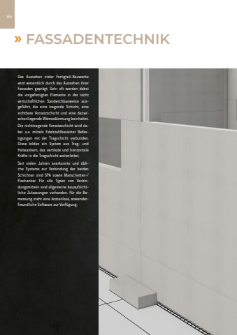 Fassade Befestigung Trittschallschutz Erdung Transport Verbindung86%u00bb FASSADENTECHNIKDas Aussehen vieler Fertigteil-Bauwerke wird wesentlich durch das Aussehen ihrer Fassaden gepr%u00e4gt. Sehr oft werden dabei die vorgefertigten Elemente in der recht wirtschaftlichen Sandwichbauweise ausgef%u00fchrt, die eine tragende Schicht, eine sichtbare Vorsatzschicht und eine dazwischenliegende W%u00e4rmed%u00e4mmung beinhaltet. Die nichttragende Vorsatzschicht wird dabei u.a. mittels Edelstahlbasierter Befestigungen mit der Tragschicht verbunden. Diese bilden ein System aus Trag- und Halteankern, das vertikale und horizontale Kr%u00e4fte in die Tragschicht weiterleitet.Seit vielen Jahren anerkannte und %u00fcbliche Systeme zur Verbindung der beiden Schichten sind SPA sowie Manschetten-/Flachanker. F%u00fcr alle Typen von Verbindungsmitteln sind allgemeine bauaufsichtliche Zulassungen vorhanden. F%u00fcr die Bemessung steht eine kostenlose, anwenderfreundliche Software zur Verf%u00fcgung.