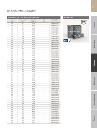 Fassade Befestigung Trittschallschutz Erdung Transport Verbindung Fassade97AUSF%u00dcHRUNG: EDELSTAHL A4, BLECHST%u00c4RKE 1,5 mmH%u00f6he Durchmesser Gewicht VE Artikel-Nr.[mm] [mm] [kg/100 St.] [St.]175 51 31,00 1 77MA15175051175 76 45,00 1 77MA15175076175 102 63,00 1 77MA15175102175 127 77,00 1 77MA15175127175 153 93,00 1 77MA15175153175 178 107,00 1 77MA15175178175 204 124,00 1 77MA15175204175 229 141,00 1 77MA15175229175 255 153,00 1 77MA15175255175 280 162,00 1 77MA15175280200 51 35,00 1 77MA15200051200 76 55,00 1 77MA15200076200 102 71,00 1 77MA15200102200 127 90,00 1 77MA15200127200 153 110,00 1 77MA15200153200 178 122,00 1 77MA15200178200 204 145,00 1 77MA15200204200 229 158,00 1 77MA15200229200 255 176,00 1 77MA15200255200 280 197,00 1 77MA15200280225 51 39,00 1 77MA15225051225 76 60,00 1 77MA15225076225 102 80,00 1 77MA15225102225 127 101,00 1 77MA15225127225 153 119,00 1 77MA15225153225 178 139,00 1 77MA15225178225 204 160,00 1 77MA15225204225 229 175,00 1 77MA15225229225 255 197,00 1 77MA15225255225 280 213,00 1 77MA15225280260 51 47,00 1 77MA15260051260 76 69,00 1 77MA15260076260 102 95,00 1 77MA15260102260 127 118,00 1 77MA15260127260 153 140,00 1 77MA15260153260 178 163,00 1 77MA15260178260 204 183,00 1 77MA15260204260 229 213,00 1 77MA15260229260 255 237,00 1 77MA15260255260 280 259,00 1 77MA15260280300 51 54,00 1 77MA15300051300 76 55,00 1 77MA15300076300 102 66,00 1 77MA15300102300 127 84,00 1 77MA15300127300 153 99,00 1 77MA15300153300 178 187,50 1 77MA15300178300 204 212,00 1 77MA15300204300 229 236,50 1 77MA15300229300 255 264,00 1 77MA15300255300 280 293,00 1 77MA15300280TRAGANKER MASandwichplattenankersystem